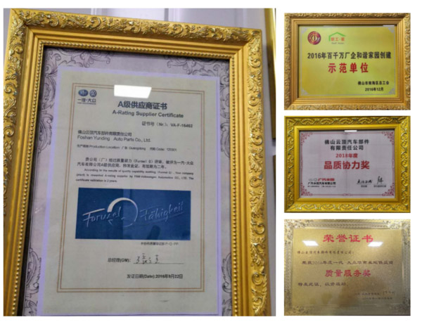 云顶汽车部件一直致力于为一线品牌汽车提供服务,凭借其专业技术,精工品质,硬核实力,获得客户好评,被评为2016年百千万厂企和谐家园创建“示范单位”,获一汽-大众华南基地供应商“质量服务奖”,广汽丰田汽车供应商“品质协力奖”等多项荣誉