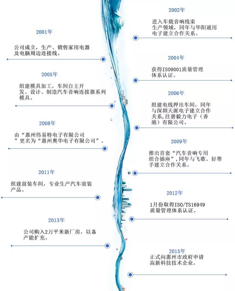 惠州奥华电子有限公司成立于2001年,公司占地面积10000平方米,建筑面积12000平方米,员工600余人。拥有一批优秀的研发、技术、生产管理人才。专业开发、生产、销售汽车插座、线束、精密连接器等汽车部件。具有汽车连接器全程制造能力,包括精密模具、塑胶成型、五金冲压、电线电缆、零部件及线束生产。公司产品已广泛应用于汽车音响、空调、防盗器、GPS导航、天窗、倒车雷达、电动门窗、仪表等汽车电子行业,并与国内外电子企业建立了良好的合作伙伴关系。
