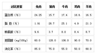 现代科学研究表明,兔肉营养价值丰富,纤维细嫩,味道鲜美,适合现代生活对肉质的要求。兔肉具有高蛋白(含蛋白质21~23%)、高赖氨酸(赖氨酸占蛋白质的9.6%)、高消化率(达85%)、高烟酸(高达12.8毫克/百克);低脂肪(仅为4.9%)、低胆固醇(为65毫克/百克)、低脲酸、低热量等特点。因此,兔肉自古以来便享有“荤中之素”的美称。
