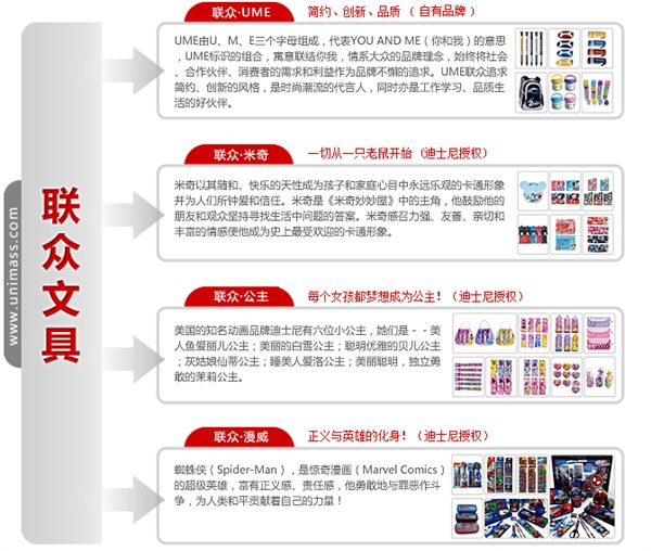 广东联众文具有限公司由现任总裁施红光先生创办于1996年。自成立以来,联众公司一直专注于学生、办公文具及新潮礼品的开发、设计、制造和销售。目前,联众公司产品线涵盖日常事务型文具、书写工具、彩绘工具、精美套装礼品、笔袋、笔盒、书包、水壶水杯、毛绒公仔等品类;品牌包括联众UME 系列、联众出奇蛋系列及迪士尼国际授权品牌系列。国内营销网络已覆盖国内30个省市,并在北京、广州、上海、南京、武汉、成都、西安、沈阳等八大城市设立了辐射全国的区域服务平台。