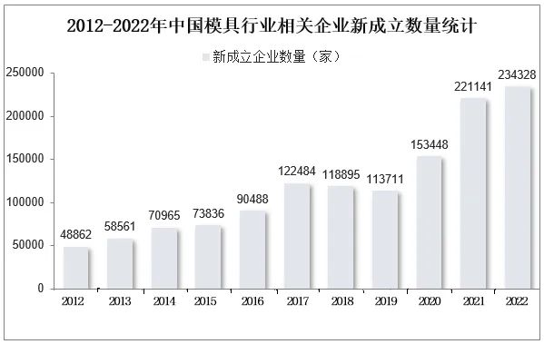 2022年全球模具行业规模超过2.1万亿元人民币,中国模具行业市场规模超过3200亿元人民币。从行业竞争格局来看,模具行业属于大行业,2012年-2022年,国内模具行业相关企业新成立数量由48862家增长到234328家。【本文数据、图表来源:华经产业研究院、凤凰网】