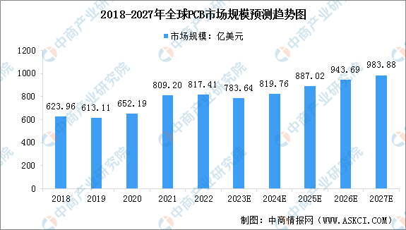 据行业知名研究机构统计,2022年全球PCB产业总产值达817.41亿美元,同比增长1.0%。随着新科技应用如AI、5G网络通信、新能源车等持续带动,预估未来5年PCB行业仍将稳步成长。根据行业权威机构预测,2022至2027年之间全球PCB行业产值将以3.8%的年复合增长率成长,到2027年将达到983.88亿美元。