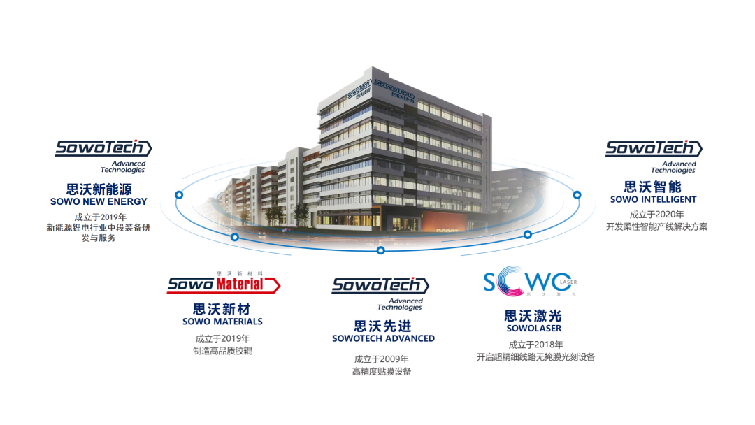 集团旗下拥有高精度贴膜设备思沃先进装备,开发柔性智能产线解决方案的思沃智能,开启超精细线路无掩膜光刻设备的思沃激光,新能源锂电设备思沃新能源,制造高品质胶辊的思沃新材。