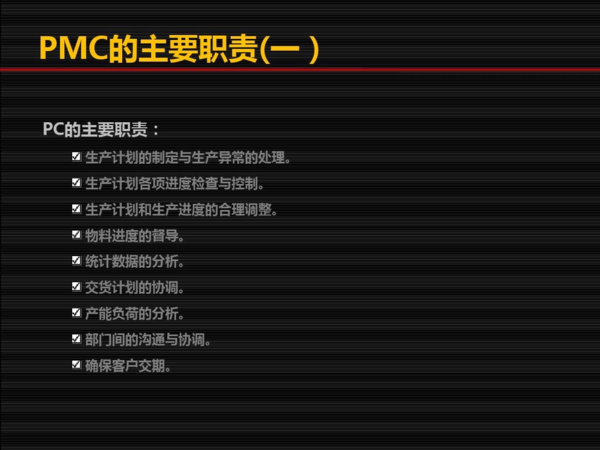 PMC意思为生产及物料控制。通常它分为两个部分: PC和MC