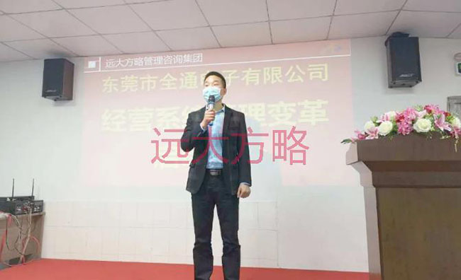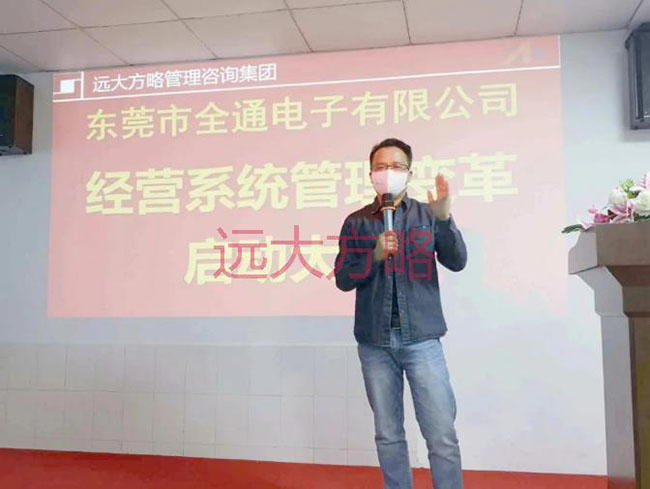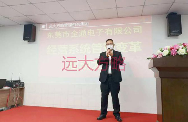项目启动会上,东莞市全通电子总经理唐忠华先生致辞表示:“ 公司进行经营系统管理变革的意义,对于全通公司,不是要不要“变”,而是怎样“变”、什么时候“变”的问题。远大方略管理咨询集团已辅导过上千家 制造型公司,我们周边有非常多的案例,我们“看见”所以“相信”。本次的合作,我们要借力远大方略,以减少全通公司在成长过程中摸索和出错的几率,用较短的时间走完较长的发展之路,实现快速腾飞。“主动是人才,被动是奴才”,所有管理者在项目合作期间,必须积极参与到这场“战役”中,并与远大方略老师互动、配合,形成推动管理改善的合力。最后,预祝本次全通公司进行的经营系统管理变革活动能够取得圆满成功,希望我们的管理团队能在这次洗礼中实现自我成长。”