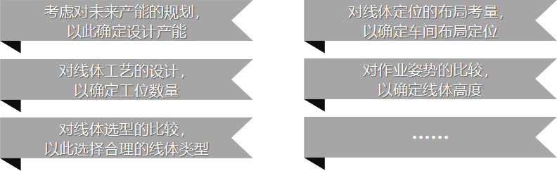 在线体规划设计项目中,我们会充分考虑对未来产能的规划,以此确定设计产能;对线体工艺的设计,以确定工位数量;对线体选型的比较,以此选择合理的线体类型;对线体定位的布局考量,以确定车间布局定位;对作业姿势的比较,以确定线体高度;对尺寸骨架的设计,以确定主体尺寸;对工装吊架设计的考虑,以确定吊架方式选择;对工位详细布局,通过工艺模拟验证;对辅助设施设置的考虑,以满足特殊需求;对外部接口的考虑,以提前预留对外施工接口。以实现线体规划的有效性及合理性。