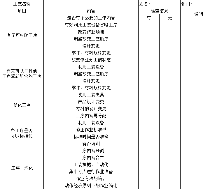 产品工艺分析检查表将工作中可能涉及的问题进行了汇总,这样大大简化了思考过程,使分析过程变得更直观、更简便。产品工艺分析的内容可以根据分析者的需要自行设计,如表所示: