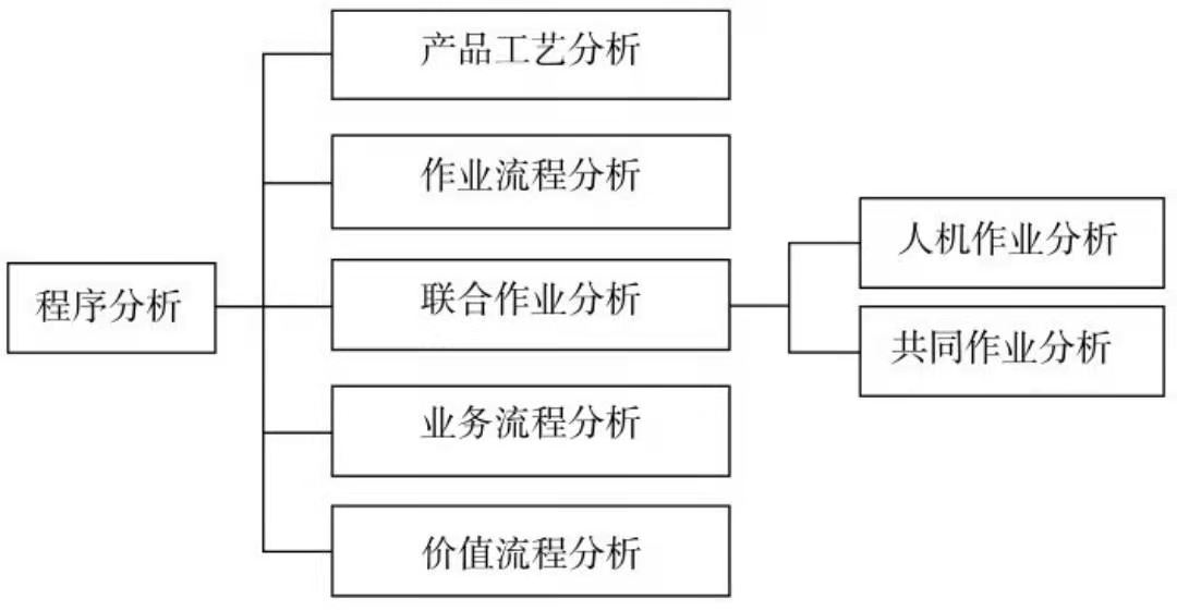 程序分析按分析对象不同,分为以产品工艺为中心的产品工艺分析和以人为中心的作业流程分析,同时为表达操作者与机械之间的作业程序或多名操作者之间的作业程序,又有联合作业分析。其中联合作业分析又因作业的对象不同分为作业人员分析法和共同作业分析法。