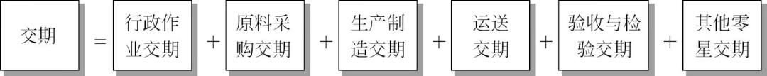 (1)行政作业交期。行政作业所包含的时间是采购方与供应商之间共同为完成采购行为所必须进行的文书及准备工作。采购方包括选择或开发供应商、准备采购订单、取得采购授权、签发订单等。供应商包括订单进入生产流程、确认库存、客户信用调查、生产能力分析等。