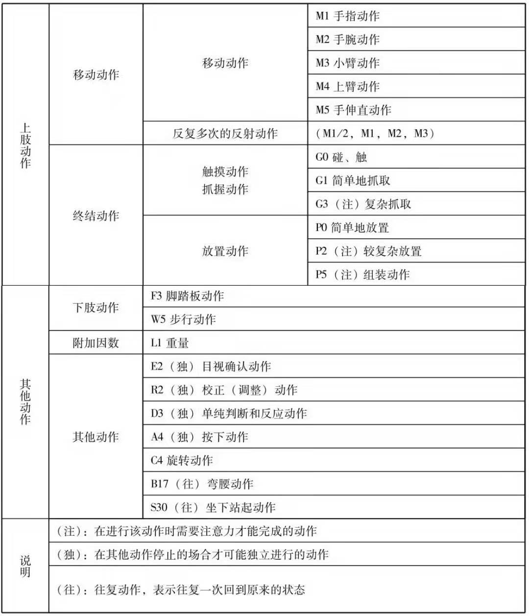 (3) 如同WF法一样,MODAPTS法的动作也是由人体器官有限的几个部位在适合的距离、重量情况下所能完成的动作构成。