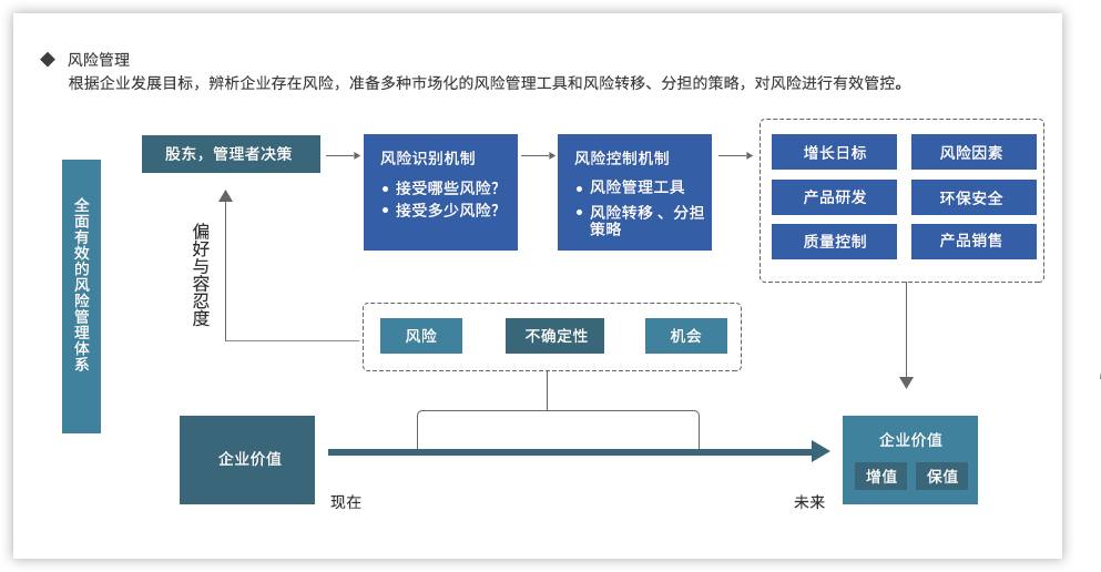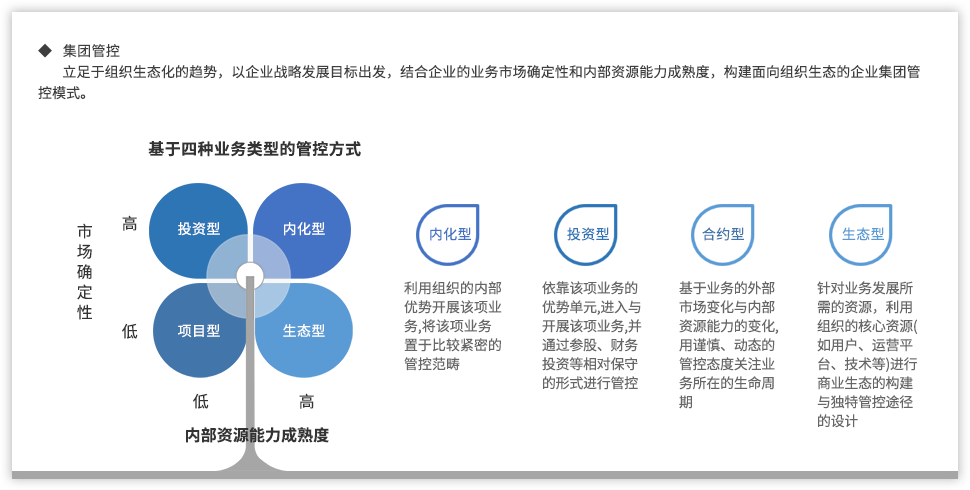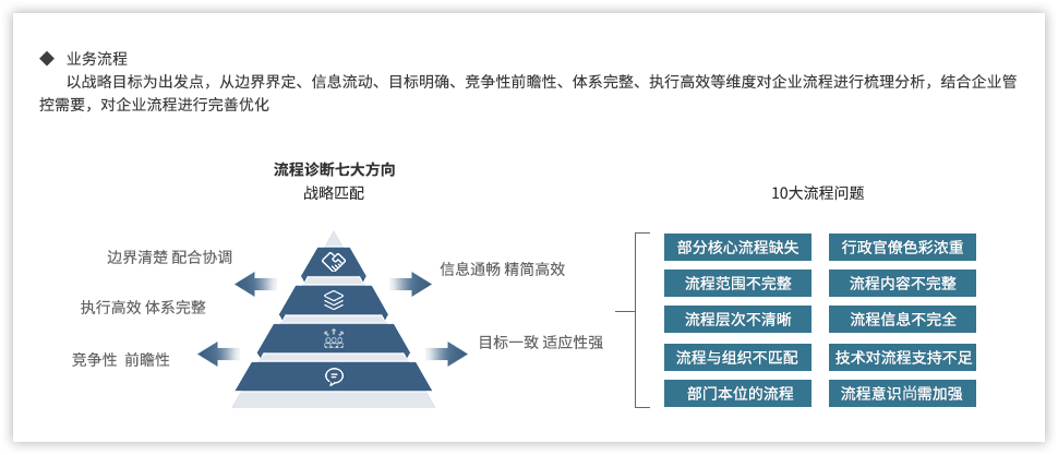 远大方略认为,为了强化国有企业组织管控能力,企业需要以战略发展目标为出发点,从组织架构、集团管控、业务流程、风险管理、财务管控等各个方面进行全面提升,构建系统全面的管控体系。