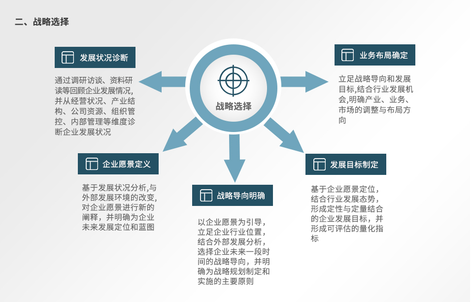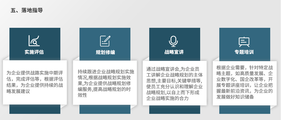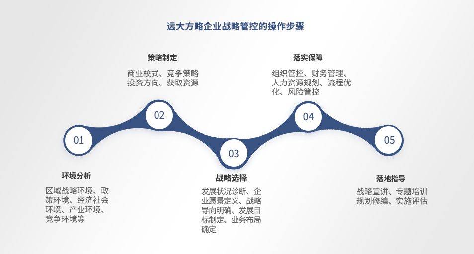 面临未来更为复杂的发展环境,远大方略将从环境分析、战略选择、策略制定、落实保障、落地指导等方面帮助客户形成完整的战略管理体系并推动落地实施。