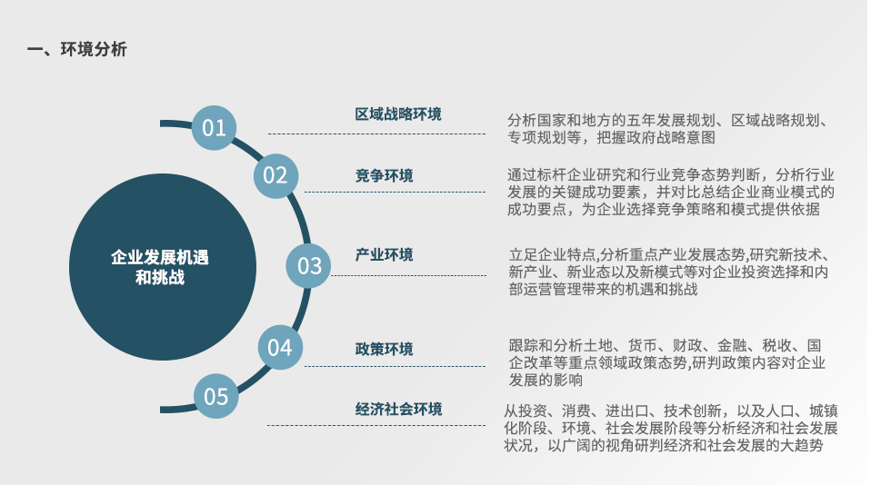 面对全球经济不确定性的加剧与人口红利的消退,中国经济增长将从要素驱动与投资驱动,转向创新驱动。为了应对未来我国经济和社会发展的变化,寻求新的发展机遇,在市场竞争中占据优势,企业需要准确研判区域战略环境、政策环境、经济社会环境、产业环境、竞争环境等,根据自身发展现状,明确企业愿景、战略导向、发展目标和业务布局方向,从商业模式、竞争策略、投资方向、资源获取等方面规划发展战略,并为战略落实构建合理的战略保障体系。
