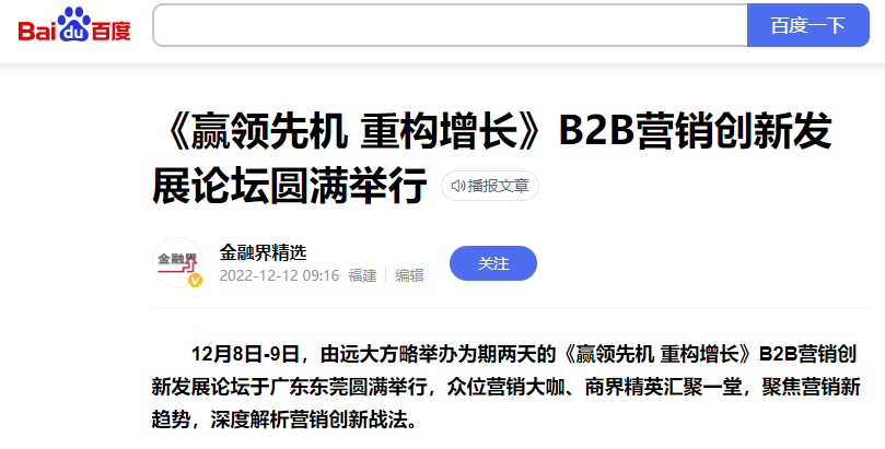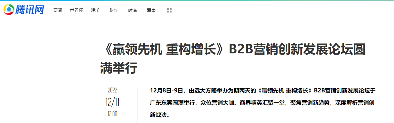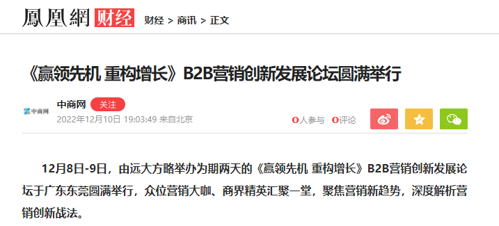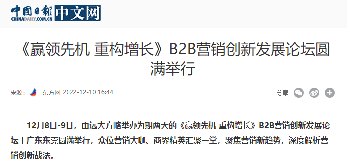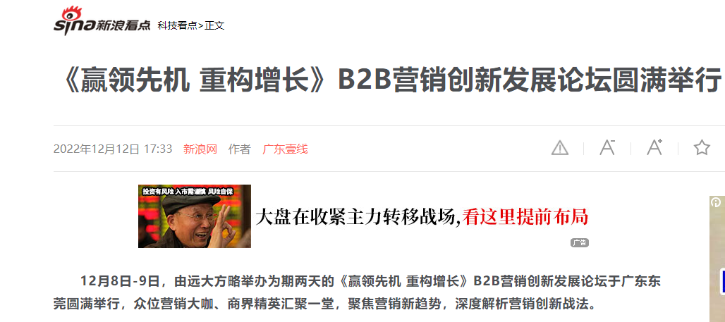 12月8日-9日,由远大方略举办为期两天的《赢领先机 重构增长》B2B营销创新发展论坛于广东东莞圆满举行,众位营销大咖、商界精英汇聚一堂,聚焦营销新趋势,深度解析营销创新战法。