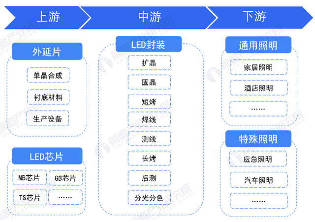 LED照明行业由上游的外延片及LED芯片厂商、中游的LED封装以及下游照明应用领域组成。上游的外延片及LED芯片 ,主要提供LED封装环节的原材料;中游LED封装主要是通过扩晶、固晶、短烤、焊线等一系列流程完成LED产品的制造;下游应用则分为通用照明及特殊照明两大类,通用照明包括家居照明、酒店照明等;特殊照明则包括应急照明、汽车照明等。