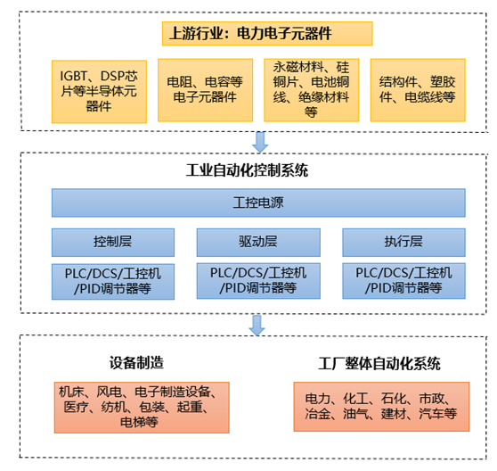 工控电源产业链主要包括原材料供应商、工业自动化控制系统供应商、OEM型行业客户和项目型行业客户。其中,产业链上游是原材料供应商,主要提供半导体元器件、电子元器件、永磁材料、硅钢片、电磁铜线、绝缘材料、结构件、塑胶件、电缆线等;产业链中游为工业自动化控制系统供应商,负责将工控电源、控制层、驱动层、执行层部件集成为工业自动化控制系统;产业链的下游行业分为设备制造市场和工厂整体自动化系统的设计和实施市场。