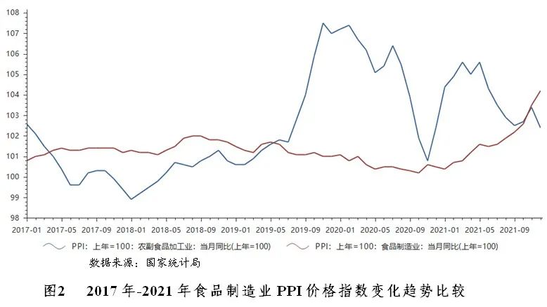由于成本端原材料、包材、运费齐涨,产业链利润被挤压,2021年食品制造业出厂价格呈现上涨趋势。国家统计局数据显示,2021年食品制造业工业生产者出厂价格指数为104.20,农副食品制造业工业生产者出厂价格指数为102.4,表明食品价格较2020年同期略有增长。在“疫情”之下,食品作为刚需产品,需求下降不明显,价格并未受到较大影响。