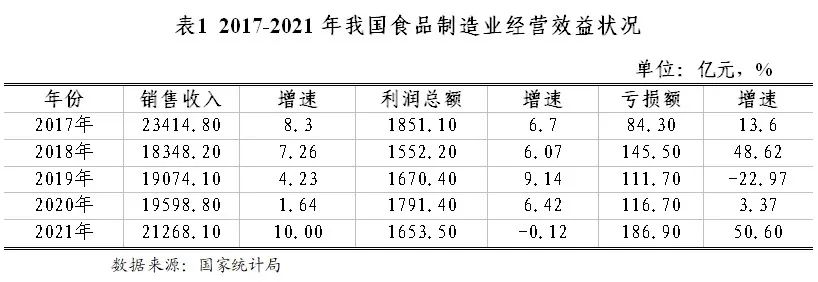 2021年,全国食品制造业销售收入为21268.10亿元,同比增长10.00%;行业利润总额为1653.50亿元,同比下降0.12%;行业亏损总额为186.90亿元,同比增长50.60 %。