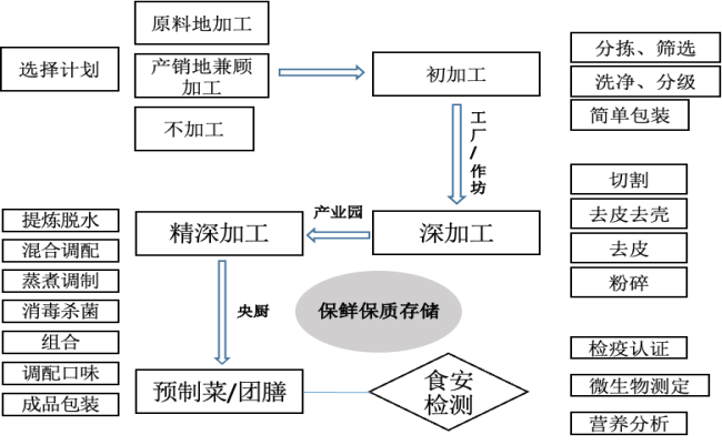 食材加工环节主要包含产地预冷、检验检疫、分拣作业、加工处理、包装、质量管理及存储(以上环节不含产地端生产/采摘等)。