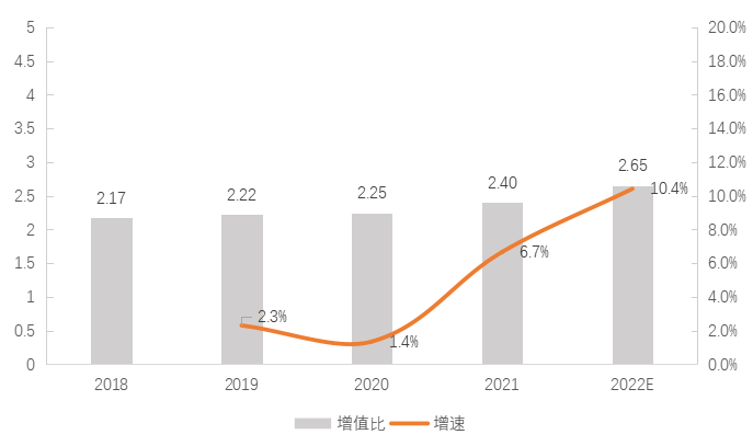 食材加工市场规模达到10.5万亿元,主要类别有:肉类、蛋类、奶及奶制品、蔬菜类、水果、水产品、谷物等,综合加工增值比为2.4:1,相比十三五初期(2016年)的产值增值比2.1:1有着重大突破,如图3-4,3-5所示。基于此趋势,2022年食材加工市场增值比增速将突破2位数,然而因受到疫情影响,能否成功突破2位数有诸多不确定因素。