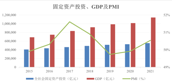 在供需改善的背景下,国内制造业景气度自 2015 年底起触底回升。同时中国工业企业设备能力利用水平、固定资产投资情况自 2016 年开始稳步增长,制 造业景气度继续上行。2020 年受新冠疫情影响,GDP 增速大幅下降,PMI 小幅提高。2021 年在疫情防控常态化下,内需稳步恢复、外贸快速增长,GDP 增速重回高位,PMI 上升至荣枯分水线之上,显示出经济扩张的讯号。