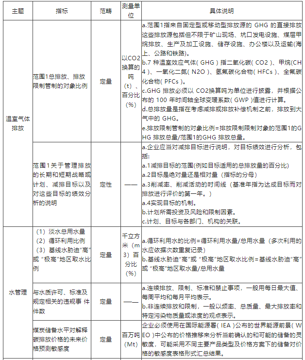 煤炭作业产业包括开采煤炭的企业和制造煤炭产品的企业,开采活动分为地下开采和露天开采,开采对象分为普通煤和原料煤。煤炭行业属于资源密集型,作业过程直接产生较多温室气体。该准则要求相关企业在温室效应煤烟排放方面对温室气体排放量进行直接披露,并对企业短期、长期的减排计划与目标按要求进行信息披露。对水资源的管理主要侧重于对水的循环利用、合规利用方面的披露。储备评估及资本支出方面侧重于对煤炭产业未来气候相关影响的预测。此外,针对煤炭行业的开采对象,该准则还要求对普通煤生产量(百万吨)和原料煤生产量(百万吨)进行披露。