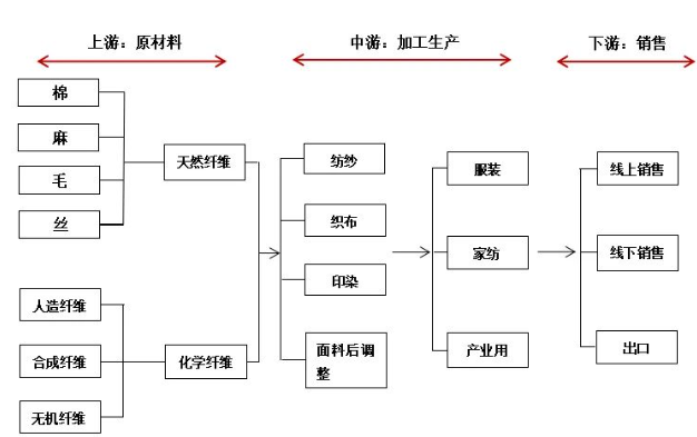 纺织服装行业属于劳动密集型产业,产业链上下游关联度较大。产业链上游原材料主要包括棉花、麻、蚕茧丝等天然纤维以及人造纤维、合成纤维等化学纤维,涉及农业种植、养殖、化工等相关行业,产业链中游主要包括纺织品、服装加工及制造环节,产业链下游主要包括各种销售渠道。