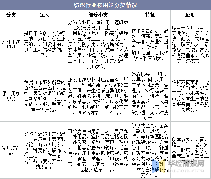 纺织行业按用途可分为产业用纺织品、服装用纺织品和家用纺织品三大类,其中产业用纺织品指的是经过专门设计、具有工程结构特点的纺织品,通常具有柔性好、可加工性强、附加值高、产业渗透面广等特点,主要应用于医疗健康、日常清洁、环境保护、安全防护、建筑交通、航空航天等领域。按产品加工方式不同,产业用纺织品可分为非织造、针织、梭织、多层复合纺织等细分品类,其中非织造工艺生产产业用纺织品即为非织造布。
