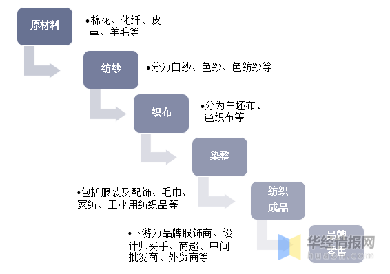 经过多年的发展,我国纺织行业形成成熟的产业链。行业上游包括棉花、化纤、皮革等原材料,下游包括品牌服饰商、商超、外贸商等。