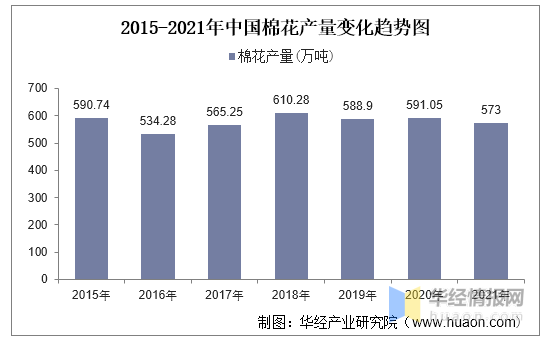 棉花是纺织行业最重要的原材料之一,目前国内外棉花供给压力均在高位,棉价或将持续向上。据国家统计局数据,2021年全国棉花产量达573万吨,较2020年减少18万吨。
