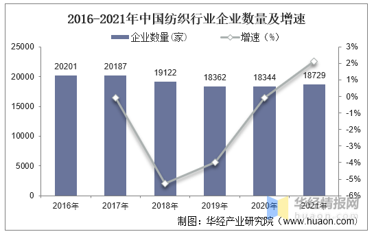 2016至2020年,我国纺织行业企业数量从20201家下降至18344家,2021年有小幅回升,达18729家,同比增长2.1%。