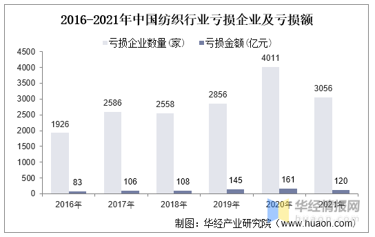 我国纺织行业亏损企业数量于2020年达到近年峰值,为4011家,同比增长40.44%,亏损金额达到161亿元,同比增长11.03%。2021年行业亏损企业数量下降至3056家,亏损金额为120亿元。