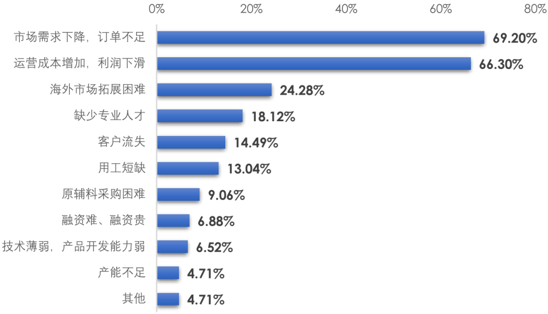 根据协会对会员企业的调研,市场需求下降和运营成本增加是当前受访企业在经营过程中面临的主要困难,海外市场拓展困难、缺少专业人才和客户流失也是企业反映较多的问题,见表3。