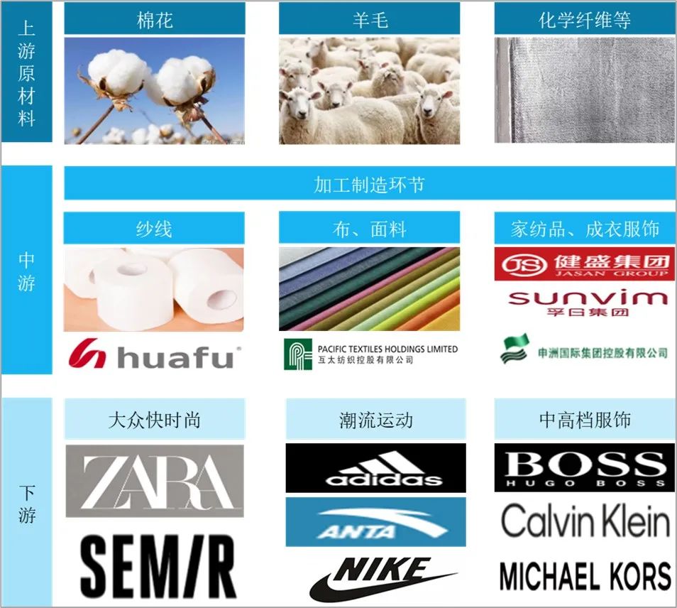 纺织业的上游原材料包括棉花、羊毛、化学纤维等,中游是纺织行业的加工及制造环节,下游产业主要有服装业、家用纺织品、产业用纺织品等。