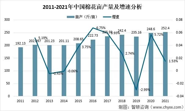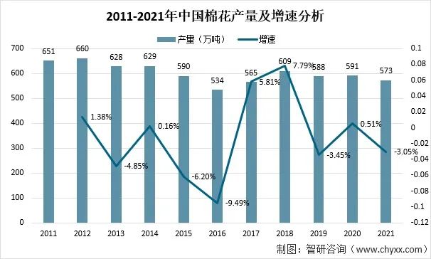 2021年,受种植效益和种植结构调整等因素影响,种植面积降幅较大,带动中国整体棉花种植面积及产量下降。全国棉花总产量573万吨,比2020年减少18万吨,下降3.05%。