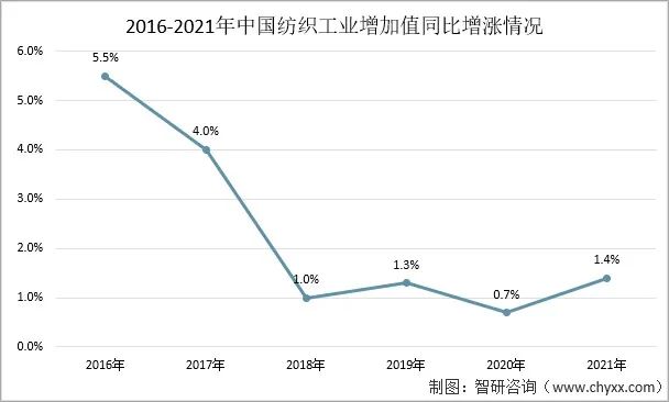 从纺织工业增加值来看,2016年-2021年中国纺织工业在稳定增涨。2021年中国纺织工业增加值同比增涨1.4%。