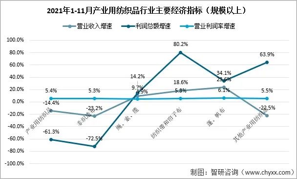 2021年1-11月产业用纺织品行业规模以上企业的营业收入同比下降14.4%,利润总额同比下降61.3%,营业利润率为5.4%。非织造布行业的营业收入和利润总额分别同比下降23.2%和72.5%,营业利润率为5.3%。绳、索、缆行业的营业收入和利润总额分别同比增长9.7%和14.2%,营业利润率为4.9%。纺织带和帘子布市场延续了良好的发展势头,营业收入和利润总额分别同比增长18.6%和80.2%,营业利润率达到5.3%。篷、帆布的营业收入和利润总额分别同比增长23.6%和34.1%,6.1%的营业利润率为行业最高。医疗卫生、过滤、土工用纺织品所在的其他产业用纺织品的营业收入和利润总额分别同比下降22.5%和63.9%,营业利润率为5.5%。