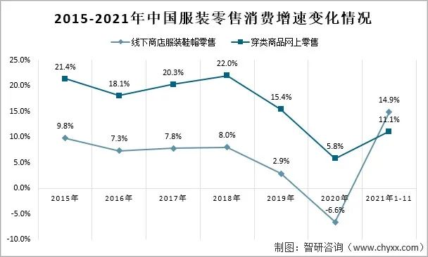 根据国家统计局数据,1~11月,实体商店服装鞋帽类商品零售总额同比增长14.9%,穿类商品网上零售额增长11.1%,虽然国内消费市场受疫情多点散发等因素影响,11月当月服装商品零售额略有下降,降幅环比收窄,但实体与网络服装零售两年平均增速持续较快增长,国内消费整体的复苏态势并未变化。