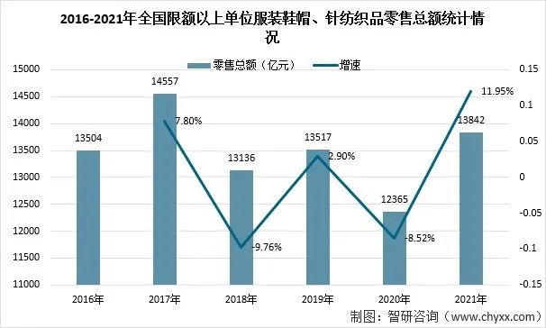 2021年全国限额以上单位服装鞋帽、针纺织品零售总额为13842亿元,同比增涨了11.95%。