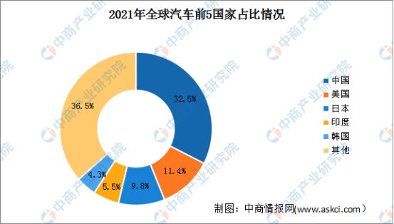 目前,中国已成为全球最大的汽车生产国。数据显示,2021年中国汽车产量占世界总产量的32.5%;美国产量占比为11.4%,全球排名第二;此外,日本、印度和韩国的比重分别为9.8%、5.5%、4.3%,位列第3-5名。