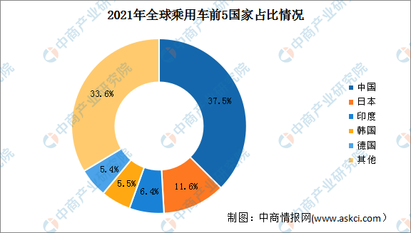 全球乘用车产量排在前5名的国家分别是中国、日本、印度、韩国和德国。其中,中国乘用车产量排名第一,占比高达37.5%,日本、印度、韩国和德国乘用车产量占比分别为11.6%、6.4%、5.5%和5.4%。