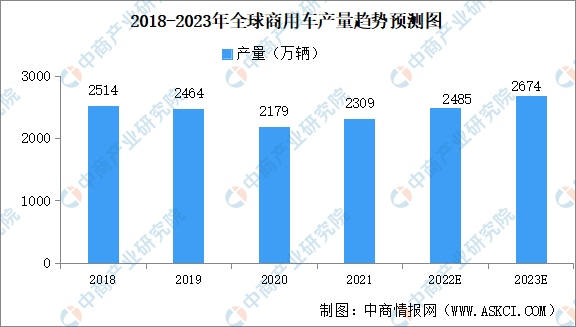 2018-2021年全球商用车(包括轻型商用车、重型卡车、客车巴士等)产量小幅波动。其中,受新冠肺炎疫情影响2020年全球商用车产量出现较大跌幅,产量降至2179万辆。随着世界工业生产与旅游业的逐步恢复,2021年全球商用车产量相较于乘用车涨幅较大,商用车产量约为2309万辆,同比增长6%。预计2023年全球商用车产量将增至2674万辆。