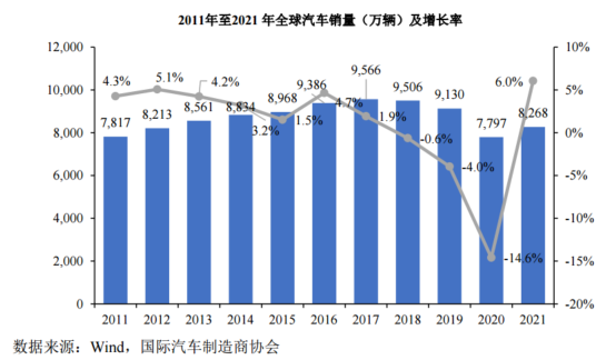 2020年,全球汽车市场低迷,汽车销量下降至7,797万辆,随着经济形势逐步好转,汽车市场逐渐回暖,2021年全球汽车销量约8,268万辆。