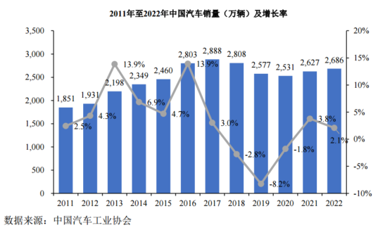 根据中国汽车工业协会统计,2022年,中国汽车销量约2,686万辆,同比增长2.1%。