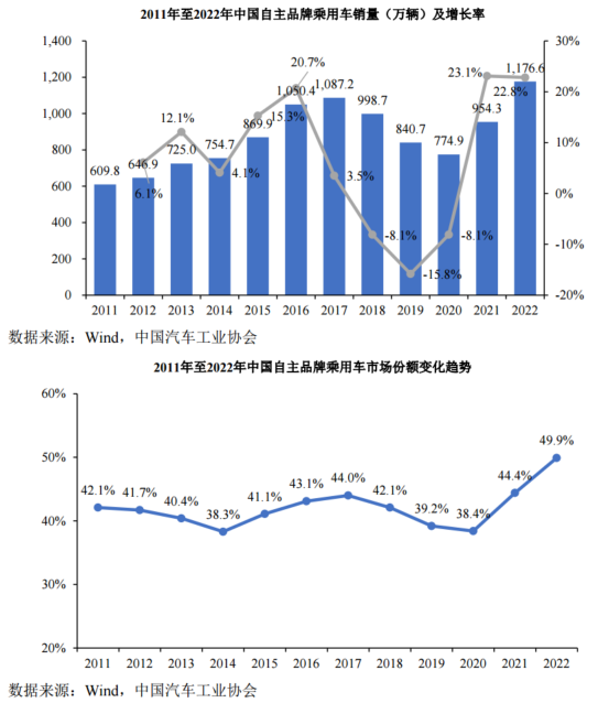 根据中国汽车工业协会统计,2022年,中国乘用车销量约2,356.3万辆,增速达到9.5%,创近六年来新高。其中,自主品牌乘用车销量约1,176.6万辆,占乘用车市场份额约49.9%,实现大幅增长。