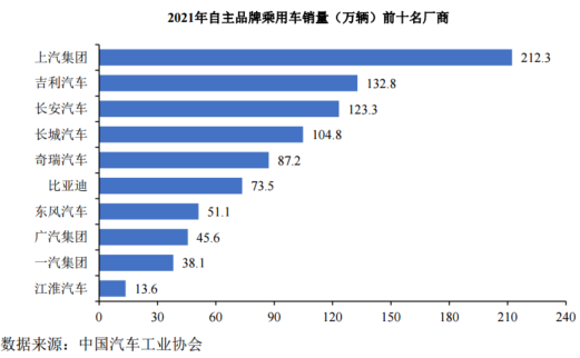 根据中国汽车工业协会统计,2021年中国自主品牌乘用车销量前十名厂商分别为:上汽集团、吉利汽车、长安汽车、长城汽车、奇瑞汽车、比亚迪、东风汽车、广汽集团、一汽集团和江淮汽车,合计销售乘用车882.3万辆,占自主品牌乘用车销量占比约92.46%,在中国乘用车总销量中占比约41.07%。