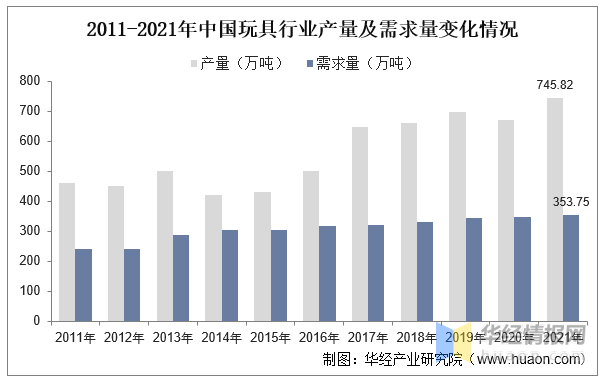 中国是世界最大的玩具生产和出口国、第二大玩具消费市场。据统计,近年来我国玩具行业产量呈现出波动增长态势,2021年玩具产量达到745.85万吨,同比增长10.97%;需求量方面保持稳定增长,从2011年的241.87万吨上升至2021年的353.75万吨,期间年均复合增长率为3.88%。