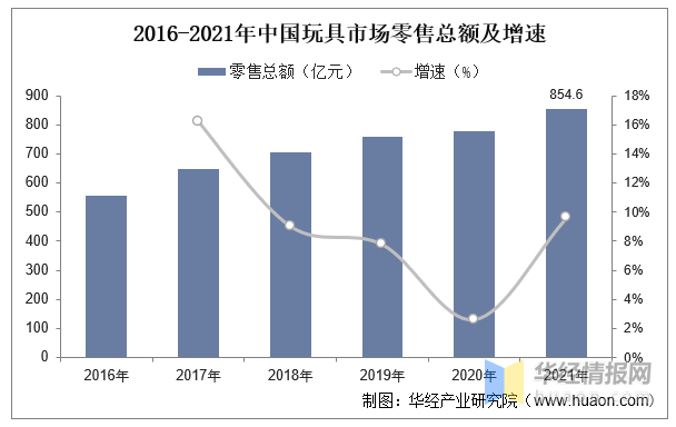 随着我国玩具制造业持续发展,零售规模稳定增长。根据中国玩具和婴童用品协会数据,从2016年到2021年,我国玩具市场零售总额逐年增长,从556亿元增长至854.6亿元,年复合增长率为8.98%,行业发展态势良好,市场空间不断拓展。