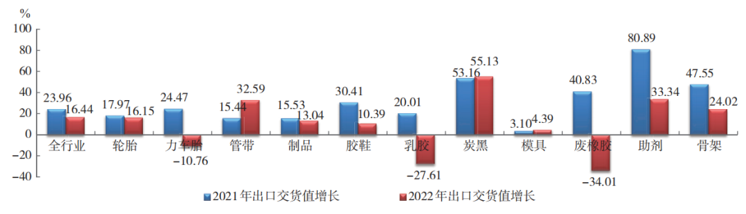 轮胎、乳胶、模具、橡胶助剂 4 个细分专业的出口率(值)高于30%,力车胎、乳胶、废橡胶综合利用3个专业出口率(值)低于上年度。