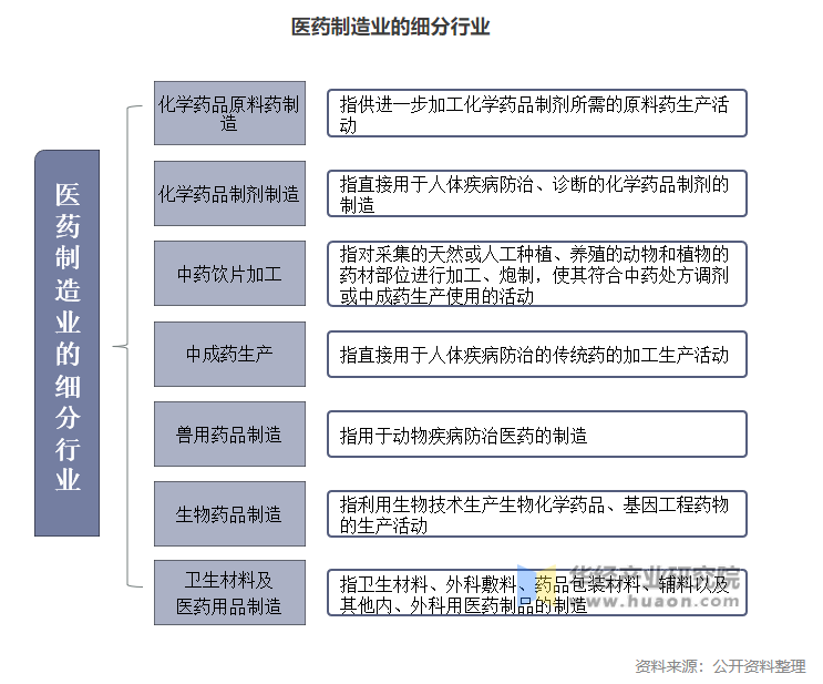 2、细分行业:医药制造业具体可以细分为化学药品原料药制造、化学药品制剂制造、中药饮片加工、中成药生产、兽用药品制造、生物药品制造和卫生材料及医药用品制造七个行业。我国医药制造企业是指以药品研发、生产及销售为主的企业。根据具体药品生产业务线的不同,《中国高技术产业统计年鉴》将我国医药制造业分为三大种类:化学药品制造、生物药品制造和中成药制造。
